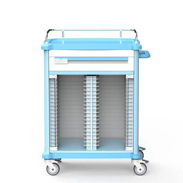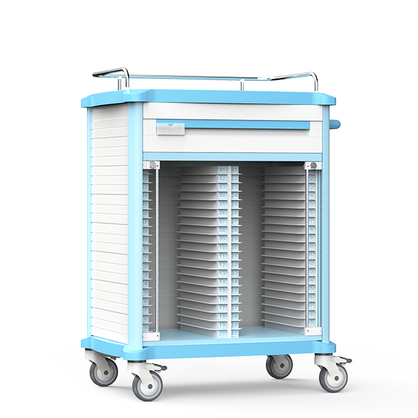 FG-D-01病历车内置多层文件隔板与透明病历卡槽,便于资料分类、调取与查阅。整体轻量高强,推行灵活,适配不同病区查房需求。