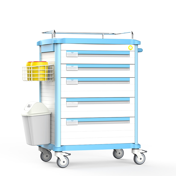 FG-B-01发药车配置五抽分区系统,浅抽内置48格药盒,支持药品精准分类与快速识别。中控联动锁机制提升发药安全性。结构轻量高强,适配高频补药场景,操作便捷,补给高效。