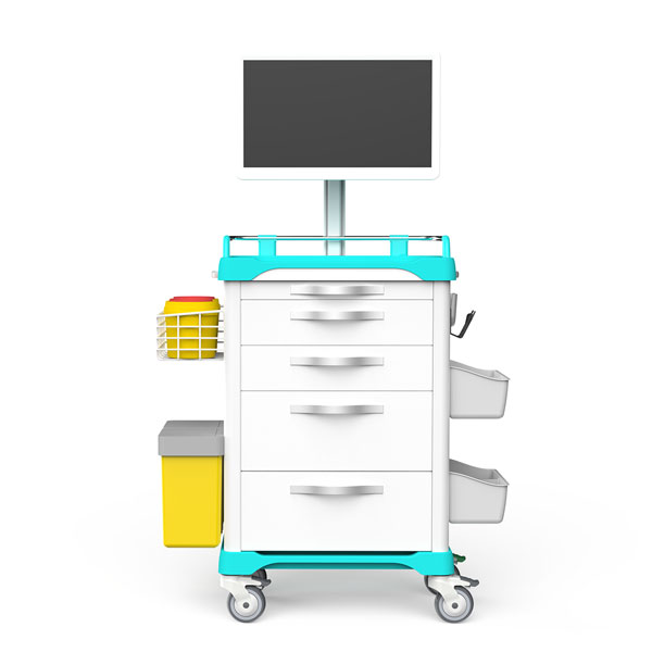 10. 脚轮: 配置φ100mm医用级静音脚轮,具备减噪减震功能,转向灵活,推行平稳。采用双刹车双定向设计,实现360°万向灵活转向及长距离直线自纠偏;