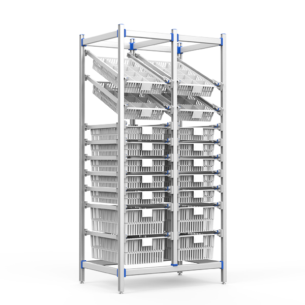 医院储存架创新搭载65°双倾斜浅篮筐(末端再倾卡位设计),集成阳极氧化铝无孔框架+ABS抗冲击卡扣,ISO标准模块化分格系统;多维标示框灵活适配检索动线,±20mm可调地脚精准调平,满足无菌环境高密度存储、快速可视存取及严苛院感管控需求。