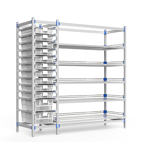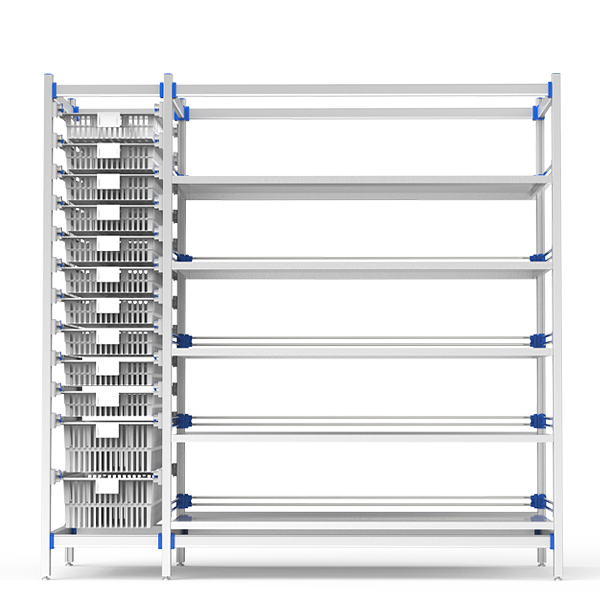耗材存放架以阳极氧化铝无孔框架+ABS抗冲击卡扣为核心,集成ISO标准篮筐(浅/深双规格)与304不锈钢活动层板;三面围栏防滑落+多维标示系统提升分拣效率,可调地脚适配复杂地面,全维度客制化满足医疗场景高密度存储、防菌防潮及跨品类混放需求。