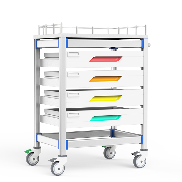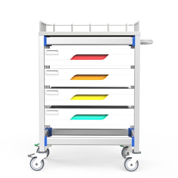送药推车以阳极氧化铝无孔框架+ABS抗冲击卡扣为核心,集成四层抽屉(三段无极间隔+静音缓冲滑轨)与模块化九宫格分装系统;医用脚轮双刹车定向稳控+台面三面围栏防滑落,适配高频静音移动场景,全维度客制化满足药品防菌分拣、精准配送及严苛院感管控需求。