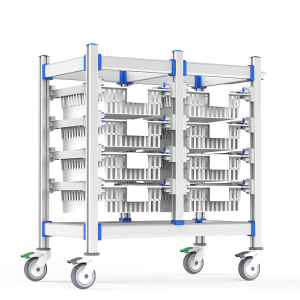 耗材存储推车以阳极氧化铝无孔框架+ABS抗冲击卡扣为核心,集成400×300mm模块化篮筐与动态分格系统;医用静音脚轮双刹车定向稳控,支持360°自纠偏与右侧推手辅助,适配高频移动场景,全维度客制化满足狭小空间防菌抑尘、高效存取及精准院感管控需求。
