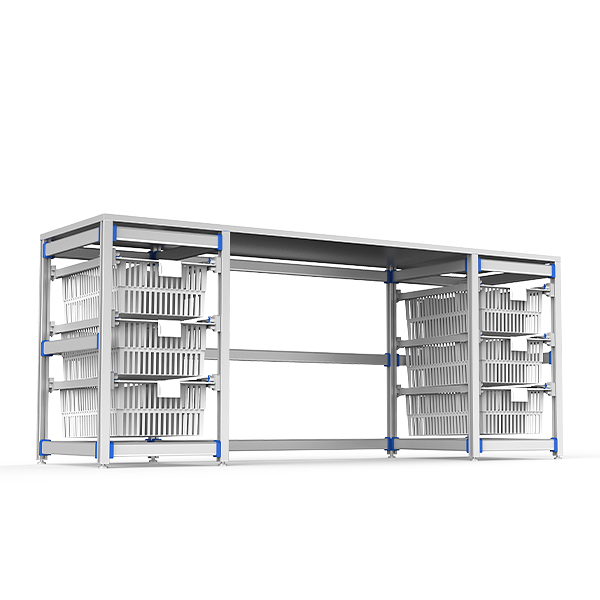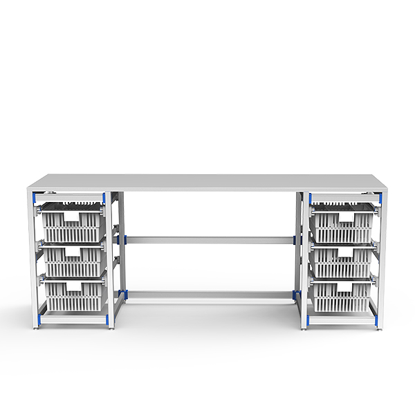 • 左右两侧各配三层篮筐,中间留空,便于操作者坐立操作,保留腿部伸展空间。