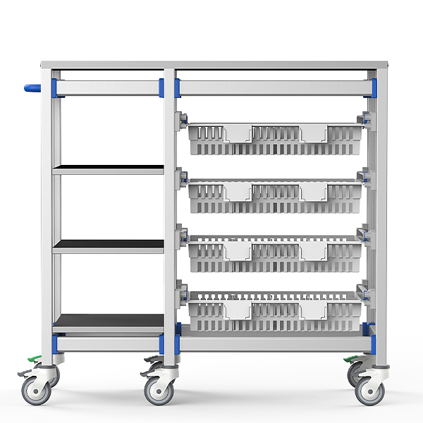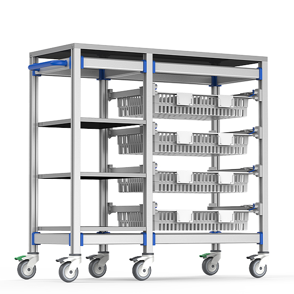 多功能耗材推车采用304不锈钢加固台面与高强度阳极氧化铝合金框架,轻盈坚固,满足医疗场景下的高频使用需求与院感控制标准。内置标准化600×400mm模块化篮筐系统,支持灵活分隔与双向标识,便于高效分类与取用。配合静音脚轮、双区收纳结构与推行手柄,整车具备卓越的移动性、实用性与定制拓展能力,适配多科室临床流线与多样化护理流程。